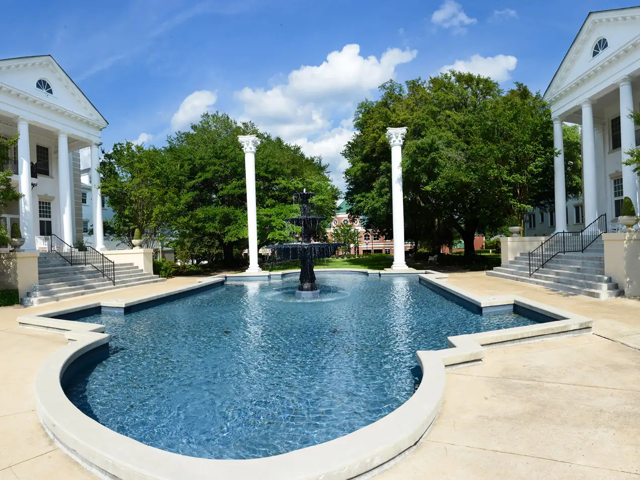 Aerial photo of Fitzhugh Hall, Preston Hall, fountain, The Commons and Student Center