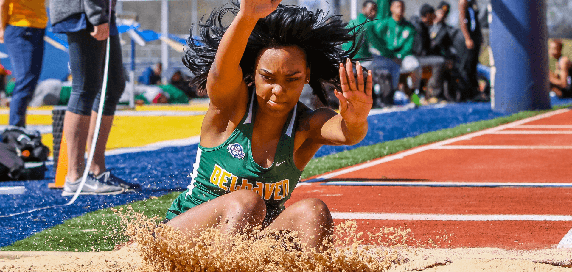 Long jumper splashing in the sand