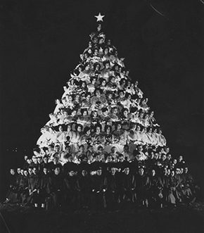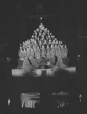 The singing Christmas tree began as an informal gathering for faculty and students to come watch Belhaven music professor Mignonne Caldwell's choir sing in the formation of a Christmas tree. Realizing that members of the community would enjoy witnessing this event, Caldwell moved the concert outside, between Preston and Fitzhugh Halls. The first wooden tree frame for the choir was constructed by Mr. C. V. McLain, an engineer. Thus, the outdoor singing Christmas tree tradition was born.